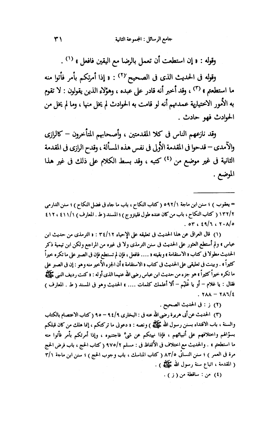 وَقَوله فِي الحَدِيث الَّذِي فِي الصَّحِيح: " {إِذا أَمرتكُم بِأَمْر فَأتوا مِنْهُ مَا اسْتَطَعْتُم} وَقد أخبر أَنه قَادر على عَبده وَهَؤُلَاء الَّذين يَقُولُونَ: لَا تقوم بِهِ " الْأُمُور الاختيارية " عمدتهم أَنه لَو قَامَت بِهِ الْحَوَادِث لم يخل مِنْهَا وَمَا لم يخل من الْحَوَادِث فَهُوَ حَادث.