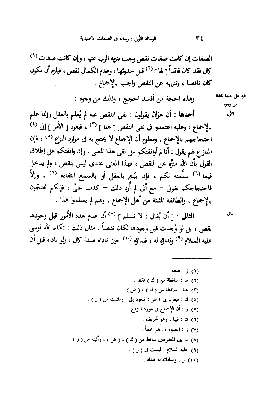(أَحدهَا) : أَن هَؤُلَاءِ يَقُولُونَ: نفي النَّقْص عَنهُ لم يعلم بِالْعقلِ وَإِنَّمَا علم " بِالْإِجْمَاع " - وَعَلِيهِ اعتمدوا فِي نفي النَّقْص هُنَا - فَيَعُود الْأَمر إِلَى احتجاجهم بِالْإِجْمَاع وَمَعْلُوم أَن الْإِجْمَاع لَا يحْتَج بِهِ فِي موارد النزاع؛ فَإِن المنازع لَهُم يَقُول أَنا لم أوافقكم على نفي هَذَا الْمَعْنى وَإِن وافقتكم على إِطْلَاق القَوْل بِأَن الله منزه عَن النَّقْص؛ فَهَذَا الْمَعْنى عِنْدِي لَيْسَ بِنَقص وَلم يدْخل فِيمَا سلمته لكم فَإِن بينتم بِالْعقلِ أَو بِالسَّمْعِ انتفاءه وَإِلَّا فاحتجاجكم بِقَوْلِي مَعَ أَنِّي لم أرد ذَلِك كذب عَليّ؛ فَإِنَّكُم تحتجون بِالْإِجْمَاع؛ والطائفة المثبتة من أهل الْإِجْمَاع وهم لم يسلمُوا هَذَا.