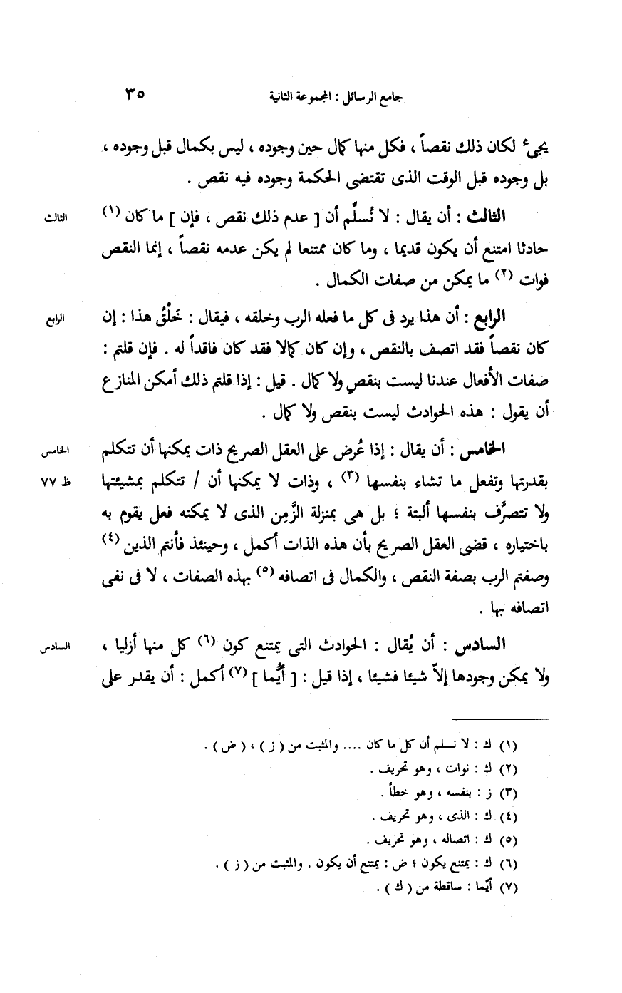 (الثَّالِث) : أَن يُقَال: لَا نسلم أَن عدم ذَلِك نقص فَإِن مَا كَانَ حَادِثا امْتنع أَن يكون قَدِيما وَمَا كَانَ مُمْتَنعا لم يكن عَدمه نقصا؛ لِأَن النَّقْص فَوَات مَا يُمكن من صِفَات الْكَمَال.
