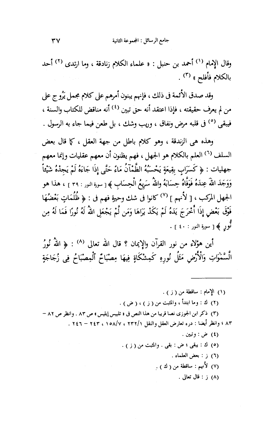 وَهَذِه هِيَ الزندقة. وَهُوَ " كَلَام بَاطِل من جِهَة الْعقل " كَمَا قَالَ بعض السّلف: الْعلم بالْكلَام هُوَ الْجَهْل فهم يظنون أَن مَعَهم عقليات وَإِنَّمَا مَعَهم جهليات: {كسراب بقيعة يحسبه الظمآن مَاء حَتَّى إِذا جَاءَهُ لم يجده شَيْئا وَوجد الله عِنْده فوفاه حسابه وَالله سريع الْحساب} . هَذَا هُوَ الْجَهْل الْمركب؛ لأَنهم كَانُوا فِي شكّ وحيرة فهم فِي ظلمات بَعْضهَا فَوق بعض إِذا أخرج يَده لم يكد يَرَاهَا وَمن لم يَجْعَل الله لَهُ نورا فَمَا لَهُ من نور.