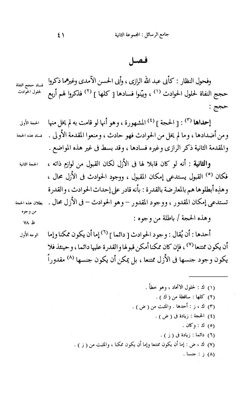 وفحول النظار " كَأبي عبد الله الرَّازِيّ وَأبي الْحسن الْآمِدِيّ " وَغَيرهمَا ذكرُوا حجج النفاة " لحلول الْحَوَادِث " وبينوا فَسَادهَا كلهَا. فَذكرُوا لَهُم أَربع حجج: