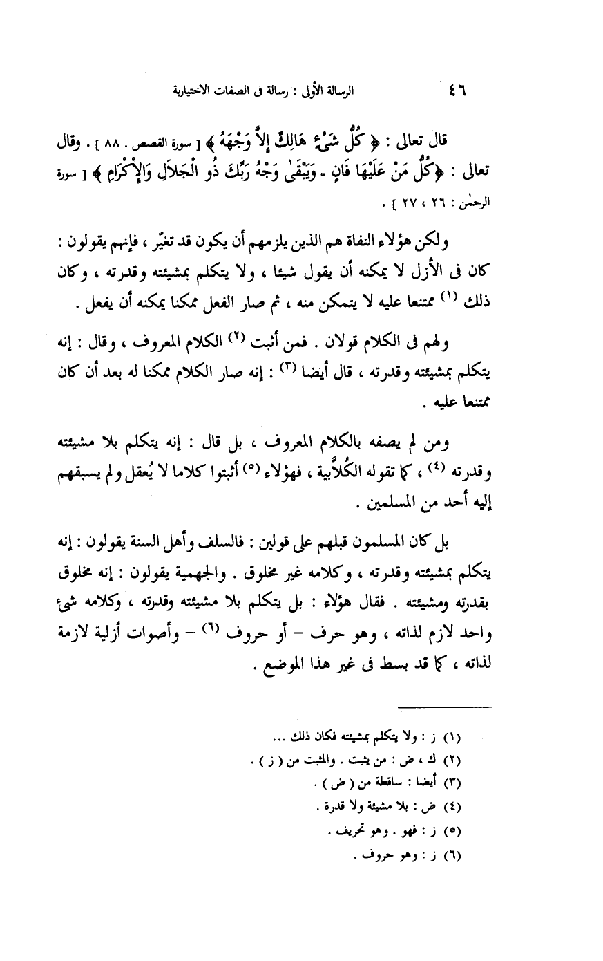 وَلَهُم فِي " الْكَلَام " قَولَانِ. فَمن أثبت الْكَلَام الْمَعْرُوف وَقَالَ: إِنَّه يتَكَلَّم بمشيئته وَقدرته قَالَ أَيْضا: إِنَّه صَار الْكَلَام مُمكنا لَهُ بعد أَن كَانَ مُمْتَنعا عَلَيْهِ.