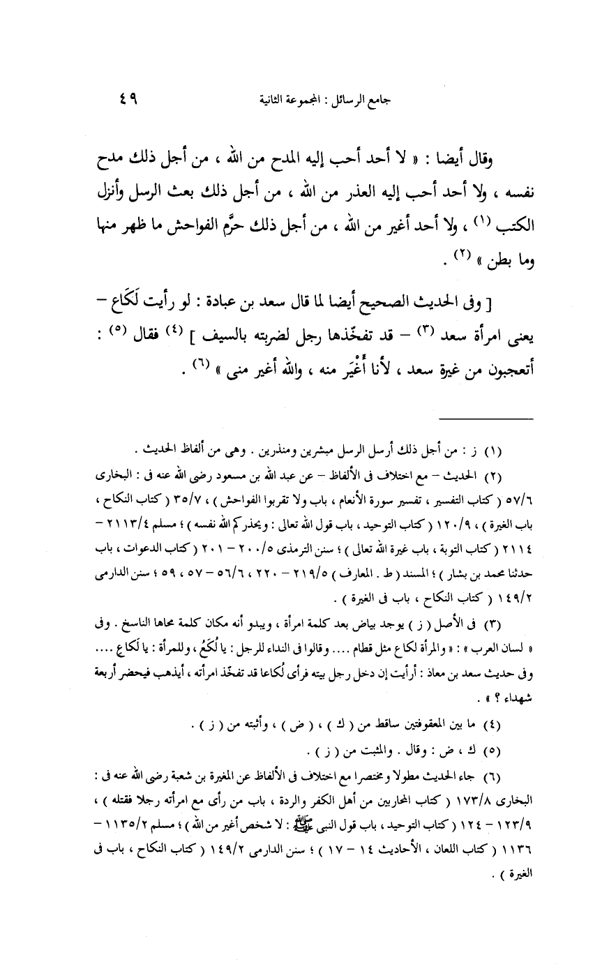 وَقَالَ أَيْضا " {لَا أحد أحب إِلَيْهِ الْمَدْح من الله من أجل ذَلِك مدح نَفسه وَلَا أحد أحب إِلَيْهِ الْعذر من الله من أجل ذَلِك بعث الرُّسُل وَأنزل الْكتب وَلَا أحد أغير من الله من أجل ذَلِك حرم الْفَوَاحِش مَا ظهر مِنْهَا وَمَا بطن} ".