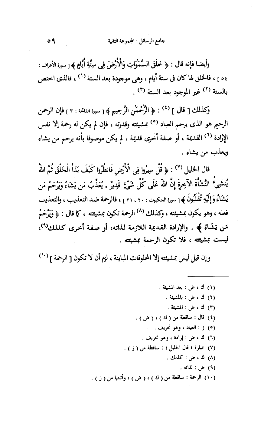 قَالَ الْخَلِيل: {قل سِيرُوا فِي الأَرْض فانظروا كَيفَ بَدَأَ الْخلق ثمَّ الله ينشئ النشأة الْآخِرَة إِن الله على كل شَيْء قدير} {يعذب من يَشَاء وَيرْحَم من يَشَاء وَإِلَيْهِ تقلبون} فالرحمة ضد التعذيب والتعذيب فعله وَهُوَ يكون بمشيئته؛ وَكَذَلِكَ الرَّحْمَة تكون بمشيئته؛ كَمَا قَالَ: {وَيرْحَم من يَشَاء} . والإرادة الْقَدِيمَة اللَّازِمَة لذاته - أَو صفة أُخْرَى كَذَلِك - لَيست بمشيئته؛ فَلَا تكون الرَّحْمَة بمشيئته.