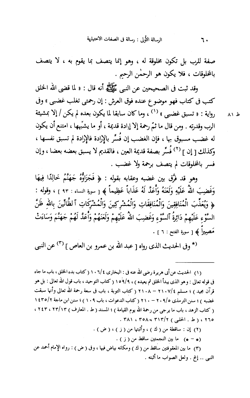 وَقد ثَبت فِي الصَّحِيحَيْنِ عَن النَّبِي صلى الله عَلَيْهِ وَسلم أَنه قَالَ: " {لما قضى الله الْخلق كتب فِي كتاب فَهُوَ مَوْضُوع عِنْده فَوق الْعَرْش: إِن رَحْمَتي تغلب غَضَبي} - وَفِي رِوَايَة - تسبق غَضَبي ". وَمَا كَانَ سَابِقًا لما يكون بعده لم يكن إِلَّا بِمَشِيئَة الرب وَقدرته. وَمن قَالَ: مَا ثمَّ رَحْمَة إِلَّا إِرَادَة قديمَة أَو مَا يشبهها امْتنع أَن يكون لَهُ غضب مَسْبُوق بهَا فَإِن الْغَضَب إِن فسر بالإرادة فالإرادة لم تسبق نَفسهَا وَكَذَلِكَ إِن فسر بِصفة قديمَة الْعين فالقديم لَا يسْبق بعضه بَعْضًا وَإِن فسر بالمخلوقات لم يَتَّصِف برحمة وَلَا غضب.