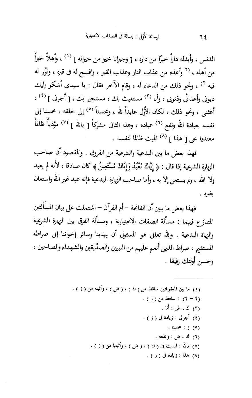 فَهَذَا بعض مَا يبين أَن " الْفَاتِحَة " أم الْقُرْآن: اشْتَمَلت على بَيَان الْمَسْأَلَتَيْنِ الْمُتَنَازع فيهمَا: " مَسْأَلَة الصِّفَات الاختيارية " وَمَسْأَلَة " الْفرق بَين الزِّيَارَة الشَّرْعِيَّة والزيارة البدعية ". وَالله تَعَالَى هُوَ الْمَسْئُول أَن يهدينا وَسَائِر إِخْوَاننَا إِلَى صراطه الْمُسْتَقيم صِرَاط الَّذين أنعم عَلَيْهِم من النَّبِيين وَالصديقين وَالشُّهَدَاء وَالصَّالِحِينَ وَحسن أُولَئِكَ رَفِيقًا.