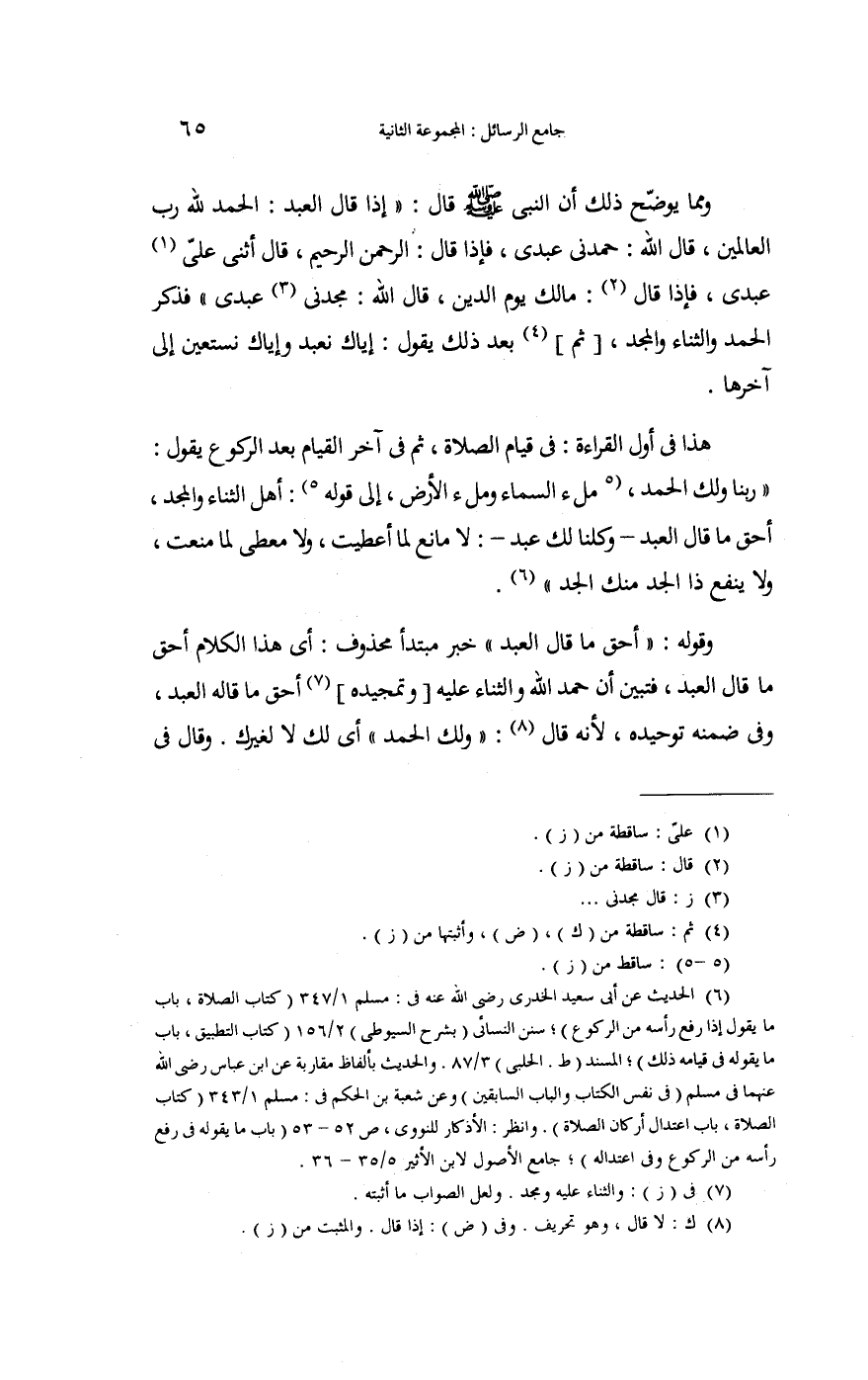 وَمِمَّا يُوضح ذَلِك أَن النَّبِي صلى الله عَلَيْهِ وَسلم قَالَ: {إِذا قَالَ العَبْد: {الْحَمد لله رب الْعَالمين} قَالَ الله: حمدني عَبدِي فَإِذا قَالَ: {الرَّحْمَن الرَّحِيم} قَالَ أثنى عَليّ عَبدِي. فَإِذا قَالَ: {مَالك يَوْم الدَّين} قَالَ الله: مجدني عَبدِي فَذكر الْحَمد وَالثنَاء وَالْمجد، ثمَّ بعد ذَلِك يَقُول: {إياك نعْبد وَإِيَّاك نستعين} إِلَى آخرهَا.