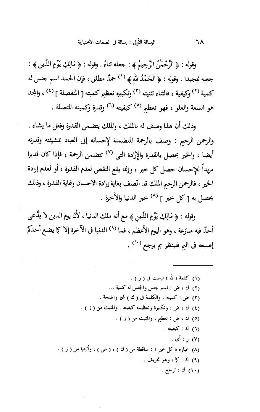 وَقَوله {الرَّحْمَن الرَّحِيم} جعله ثَنَاء. وَقَوله {مَالك يَوْم الدَّين} جعله تمجيدا. وَقَوله: {الْحَمد لله} حمد مُطلق. فَإِن " الْحَمد " اسْم جنس لَهُ كمية وَكَيْفِيَّة؛ فالثناء تثنيته، وتكبيره تَعْظِيم كميته الْمُنْفَصِلَة، و " الْمجد " هُوَ السعَة والعلو فَهُوَ تَعْظِيم كيفيته وَقدره وكميته الْمُتَّصِلَة.