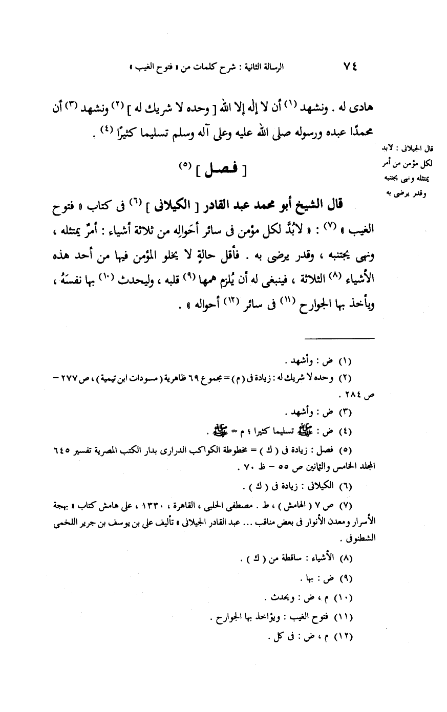 قَالَ الشَّيْخ أَبُو مُحَمَّد عبد الْقَادِر الكيلاني فِي كتاب " فتوح الْغَيْب ": لَا بُد لكل مُؤمن فِي سَائِر أَحْوَاله من ثَلَاثَة أَشْيَاء: أَمر يمتثله. وَنهي يجتنبه. وَقدر يرضى بِهِ. فَأَقل حَالَة لَا يَخْلُو الْمُؤمن فِيهَا من أحد هَذِه الْأَشْيَاء الثَّلَاثَة فَيَنْبَغِي لَهُ أَن يلْزم همها قلبه وليحدث بهَا نَفسه وَيَأْخُذ بهَا الْجَوَارِح فِي سَائِر أَحْوَاله ".