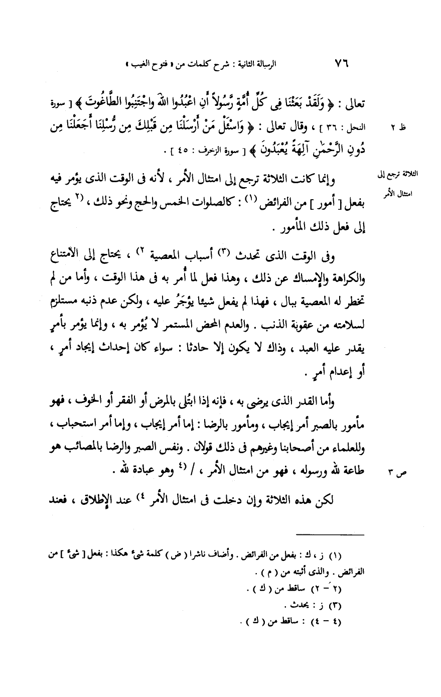 وَإِنَّمَا كَانَت " الثَّلَاثَة " ترجع إِلَى امْتِثَال الْأَمر؛ لِأَنَّهُ فِي الْوَقْت الَّذِي يُؤمر فِيهِ بِفعل أُمُور من الْفَرَائِض كالصلوات الْخمس وَالْحج وَنَحْو ذَلِك، يحْتَاج إِلَى فعل ذَلِك الْمَأْمُور.