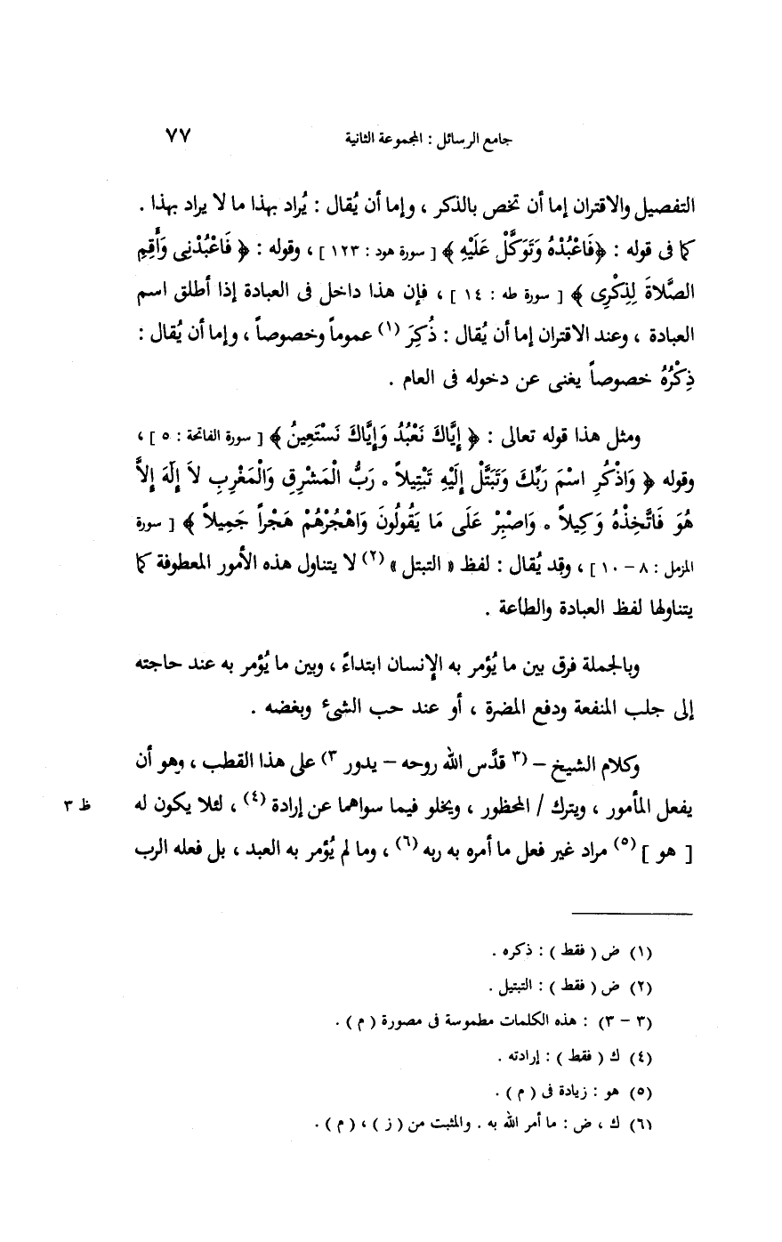وَمثل هَذَا قَوْله تَعَالَى {إياك نعْبد وَإِيَّاك نستعين} وَقَوله: {وَاذْكُر اسْم رَبك وتبتل إِلَيْهِ تبتيلا} {رب الْمشرق وَالْمغْرب لَا إِلَه إِلَّا هُوَ فاتخذه وَكيلا} {واصبر على مَا يَقُولُونَ واهجرهم هجرا جميلا} وَقد يُقَال: لفظ " التبتل " لَا يتَنَاوَل هَذِه الْأُمُور المعطوفة كَمَا يَتَنَاوَلهَا لفظ الْعِبَادَة وَالطَّاعَة.