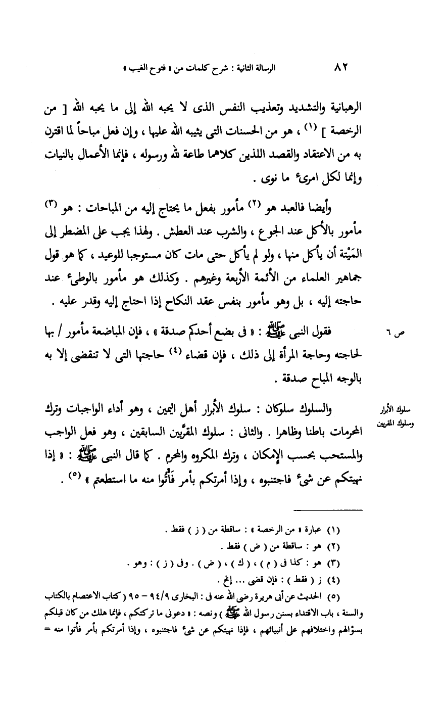 و" السلوك " سلوكان: سلوك الْأَبْرَار أهل الْيَمين وَهُوَ أَدَاء الْوَاجِبَات، وَترك الْمُحرمَات بَاطِنا وظاهرا. و (الثَّانِي) : سلوك المقربين السَّابِقين وَهُوَ فعل الْوَاجِب وَالْمُسْتَحب بِحَسب الْإِمْكَان وَترك الْمَكْرُوه وَالْمحرم كَمَا قَالَ النَّبِي صلى الله عَلَيْهِ وَسلم " {إِذا نَهَيْتُكُمْ عَن شَيْء فَاجْتَنبُوهُ. وَإِذا أَمرتكُم بِأَمْر فَأتوا مِنْهُ مَا اسْتَطَعْتُم} ".