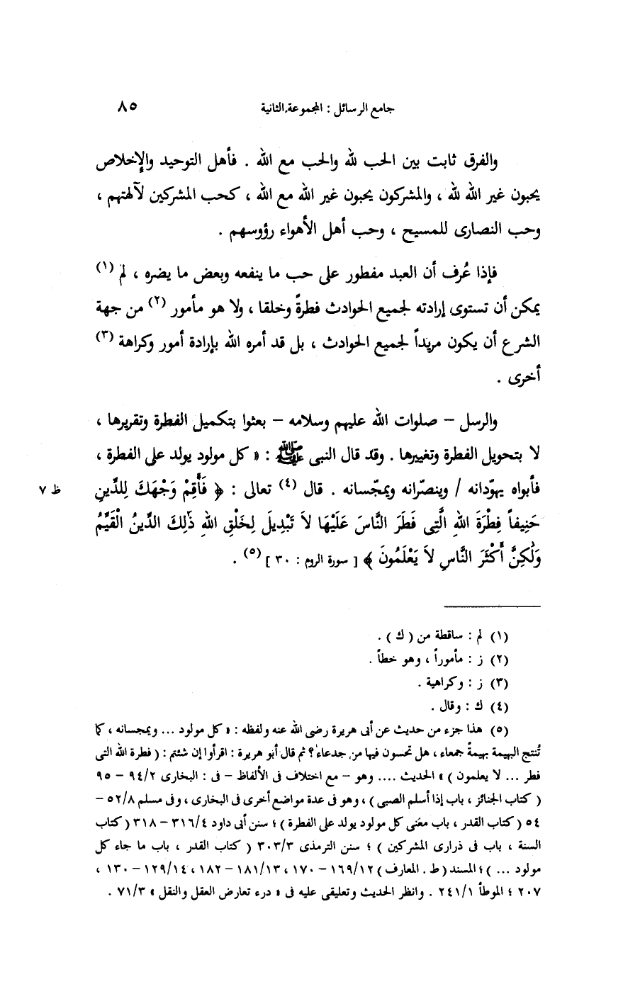 وَالرسل - صلوَات الله عَلَيْهِم وَسَلَامه - بعثوا بتكميل الْفطْرَة وتقريرها لَا بتحويل الْفطْرَة وتغييرها. وَقد قَالَ النَّبِي صلى الله عَلَيْهِ وَسلم " {كل مَوْلُود يُولد على الْفطْرَة فَأَبَوَاهُ يُهَوِّدَانِهِ وَيُنَصِّرَانِهِ ويمجسانه} " قَالَ تَعَالَى: {فأقم وَجهك للدّين حَنِيفا فطْرَة الله الَّتِي فطر النَّاس عَلَيْهَا لَا تَبْدِيل لخلق الله ذَلِك الدَّين الْقيم وَلَكِن أَكثر النَّاس لَا يعلمُونَ} .