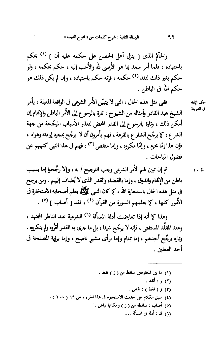 فَفِي مثل هَذِه الْحَال الَّتِي لَا يتَبَيَّن الْأَمر الشَّرْعِيّ فِي الْوَاقِعَة الْمعينَة يَأْمر الشَّيْخ عبد الْقَادِر وَأَمْثَاله من الشُّيُوخ: " تَارَة " بِالرُّجُوعِ إِلَى الْأَمر الْبَاطِن والإلهام إِن أمكن ذَلِك و " تَارَة " بِالرُّجُوعِ إِلَى الْقدر الْمَحْض لتعذر الْأَسْبَاب المرجحة من جِهَة الشَّرْع كَمَا يرجح الشَّارِع بِالْقُرْعَةِ. فهم يأمرون أَلا يرجح بِمُجَرَّد إِرَادَته وهواه فَإِن هَذَا إِمَّا محرم وَإِمَّا مَكْرُوه وَإِمَّا منقص، فهم فِي هَذَا النَّهْي كنهيهم عَن فضول الْمُبَاحَات.