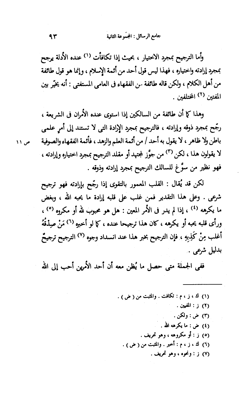 وَهَذَا كَمَا أَن طَائِفَة من السالكين إِذا اسْتَوَى عِنْده الْأَمْرَانِ فِي الشَّرِيعَة رجح بِمُجَرَّد ذوقه وإرادته فالترجيح بِمُجَرَّد الْإِرَادَة الَّتِي لَا تستند إِلَى أَمر علمي بَاطِن وَلَا ظَاهر لَا يَقُول بِهِ أحد من أَئِمَّة الْعلم والزهد. فأئمة الْفُقَهَاء والصوفية لَا يَقُولُونَ هَذَا. لَكِن من جوز لمجتهد أَو مقلد التَّرْجِيح بِمُجَرَّد اخْتِيَاره وإرادته فَهُوَ نَظِير من شرع للسالك التَّرْجِيح بِمُجَرَّد إِرَادَته وذوقه.