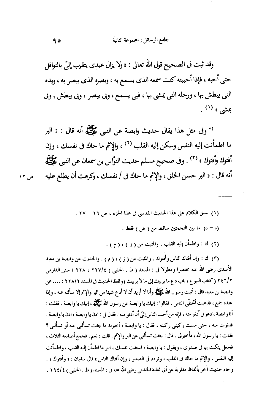 وَفِي مثل هَذَا يُقَال حَدِيث وابصة عَن النَّبِي صلى الله عَلَيْهِ وَسلم أَنه قَالَ: " الْبر مَا اطمأنت إِلَيْهِ النَّفس وَسكن إِلَيْهِ الْقلب، وَالْإِثْم مَا حاك فِي نَفسك، وَإِن أفتوك وأفتوك ". وَفِي صَحِيح مُسلم حَدِيث النواس بن سمْعَان عَن النَّبِي صلى الله عَلَيْهِ وَسلم أَنه قَالَ: " الْبر حسن الْخلق، وَالْإِثْم مَا حاك فِي نَفسك، وكرهت أَن يطلع عَلَيْهِ