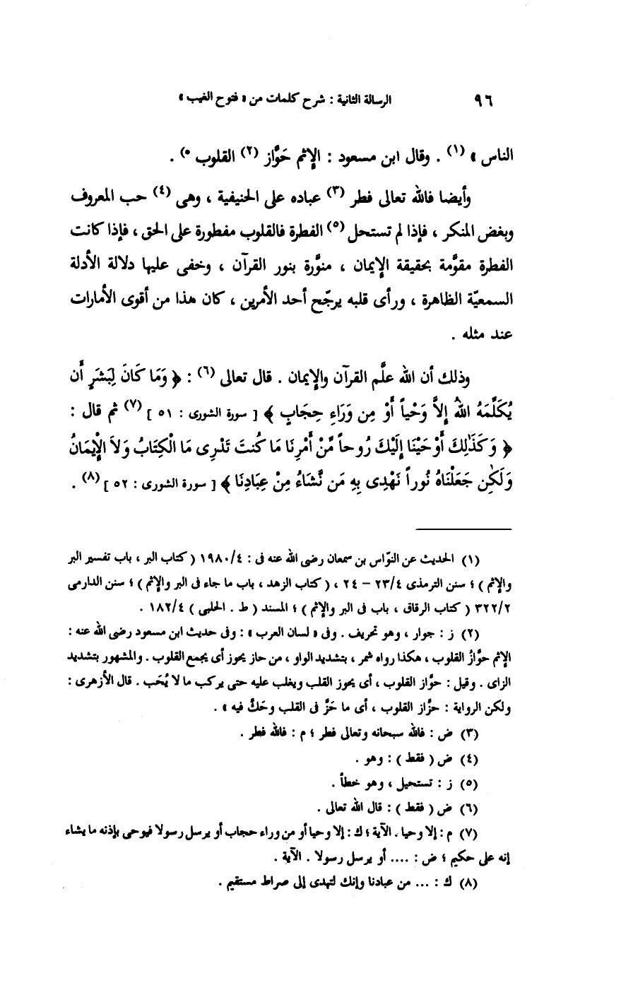 و (أَيْضا) فَالله - تَعَالَى - فطر عباده على الحنيفية: وَهِي حب الْمَعْرُوف وبغض الْمُنكر فَإِذا لم تستحل الْفطْرَة فالقلوب مفطورة على الْحق فَإِذا كَانَت الْفطْرَة مقومة بِحَقِيقَة الْإِيمَان منورة بِنور الْقُرْآن وخفي عَلَيْهَا دلَالَة الْأَدِلَّة السمعية الظَّاهِرَة وَرَأى قلبه يرجح أحد الْأَمريْنِ كَانَ هَذَا من أقوى الأمارات عِنْد مثله.