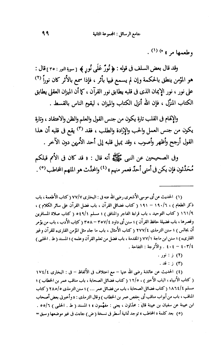 وَفِي الصَّحِيحَيْنِ عَن النَّبِي صلى الله عَلَيْهِ وَسلم أَنه قَالَ: " {قد كَانَ فِي الْأُمَم قبلكُمْ محدَّثون فَإِن يكن فِي أمتِي أحد فعمر مِنْهُم} " والمحدَّث هُوَ الملهم الْمُخَاطب.