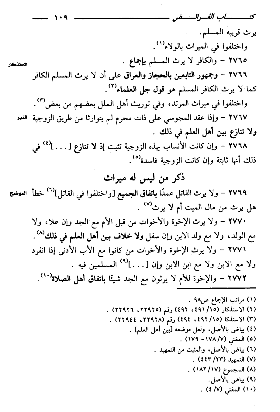 ٢٧٦٦ - وجمهور التابعين بالحجاز والعراق على أن لا يرث المسلم الكافر كما لا يرث الكافر المسلم هو قول جل العلماء.