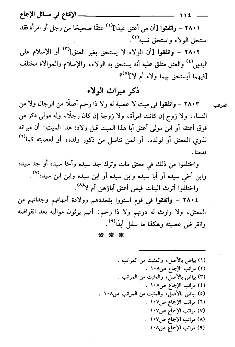 ٢٨٠٣ - واتفقوا في ميت لا عصبة له ولا ذا رحم أصلاً من الرجال ولا من النساء، ولا زوج إن كانت امرأة، ولا زوجة إن كان رجلاً، وله مولى ذكر من فوق أعتقه أو ابن مولى أعتق أبا هذا الميت قبل ولادة هذا الميت: أن ميراثه لذوي المعتق أو لولده، أو لمن تناسل من ذكور ولده، أو لعصبته كما قدمنا.