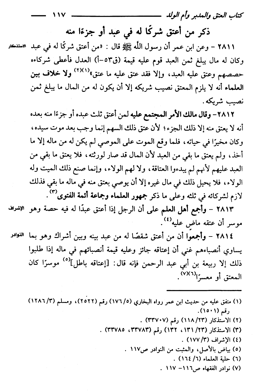 ٢٨١١ - وعن ابن عمر أن رسول الله صلى الله عليه وسلم قال: «من أعتق شركًا له في عبد وكان له مال يبلغ ثمن العبد قوم عليه قيمة العدل فأعطى شركاءه حصصهم وعتق عليه العبد، وإلا فقد عتق عليه ما عتق» ولا خلاف بين العلماء أنه لا يلزم المعتق نصيب شريكه إلا أن يكون له من المال ما يبلغ ثمن نصيب شريكه.