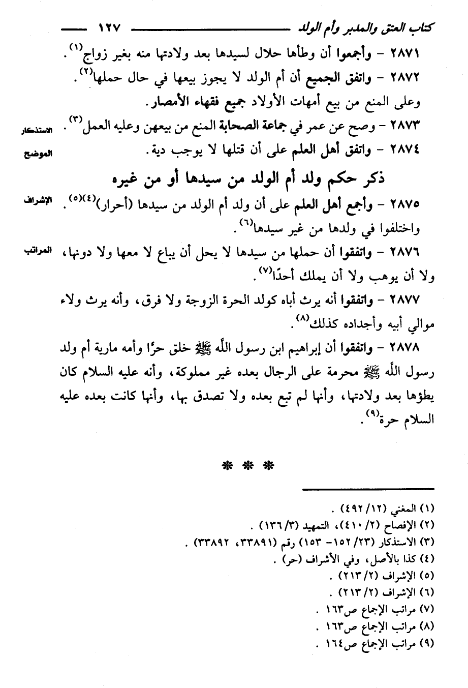 ٢٨٧٨ - واتفقوا أن إبراهيم ابن رسول الله صلى الله عليه وسلم خلق حرًا وأمه مارية أو ولد رسول الله صلى الله عليه وسلم محرمة على الرجال بعده غير مملوكة، وأنه عليه السلام كان يطؤها بعد ولادتها، وأنها لم تبع بعده ولا تصدق بها، وأنها كانت بعده عليه السلام حرة.