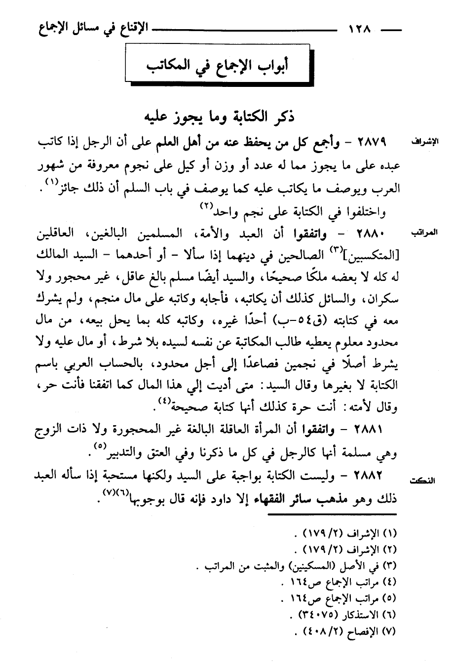 ٢٨٨٠ - واتفقوا أن العبد والأمة، المسلمين البالغين، العاقلين [المتكسبين] الصالحين في دينهما إذا سألا - أو أحدهما - السيد المالك له كله لا بعضه ملكًا صحيحًا، والسيد أيضًا مسلم بالغ عاقل، غير محجور ولا سكران، والسائل كذلك أن يكاتبه، فأجابه وكاتبه على مال منجم، ولم يشرك معه في كتابته أحدًا غيره، وكاتبه كله بما يحل بيعه، من مال محدود معلوم يعطيه طالب المكاتبة عن نفسه لسيده بلا شرط، أو مال عليه ولا يشرط أصلاً في نجمين فصاعدًا إلي أجل محدود، بالحساب العربي باسم الكتابة لا بغيرها وقال السيد: متى أديت إلي هذا المال كما اتفقنا فأنت حرة، وقال لأمته: أنت حرة كذلك أنها كتابة صحيحة.