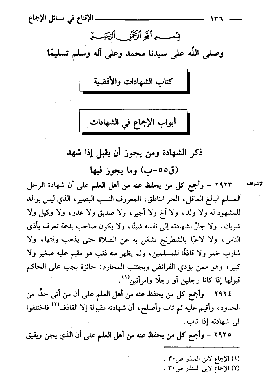 ٢٩٢٣ - وأجمع كل من يحفظ عنه من أهل العلم على أن شهادة الرجل المسلم البالغ العاقل، الحر الناطق، المعروف النسب البصير، الذي ليس بوالد للمشهود له ولا ولد، ولا أخر ولا أجير، ولا صديق ولا عدو، ولا وكيل ولا شريك، ولا جارً بشهادته إلي نفسه شيئًا، ولا يكون صاحب بدعة تعرف بأذى الناس، ولا لاعبًا بالشطرنج يشغل به عن الصلاة حتى يذهب وقتها، ولا شارب خمر ولا قاذفًا للمسلمين، ولم يظهر منه ذنب هو مقيم عليه صغير ولا كبير، وهو ممن يؤدي الفرائض ويجتنب المحارم: جائزة يجب على الحاكم قبولها إذا كانا رجلين أو رجلاً وامرأتين.