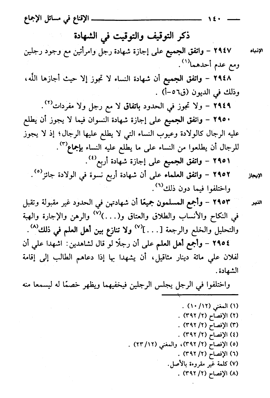 ٢٩٥٣ - وأجمع المسلمون جميعًا أن شهادتهن في الحدود غير مقبوله وتقبل في النكاح والأنساب والطلاق والعتاق و (....) والرهن والإجازة والهبة والتحليل والخلع والرجعة [...] ولا تنازع بين أهل العلم في ذلك.