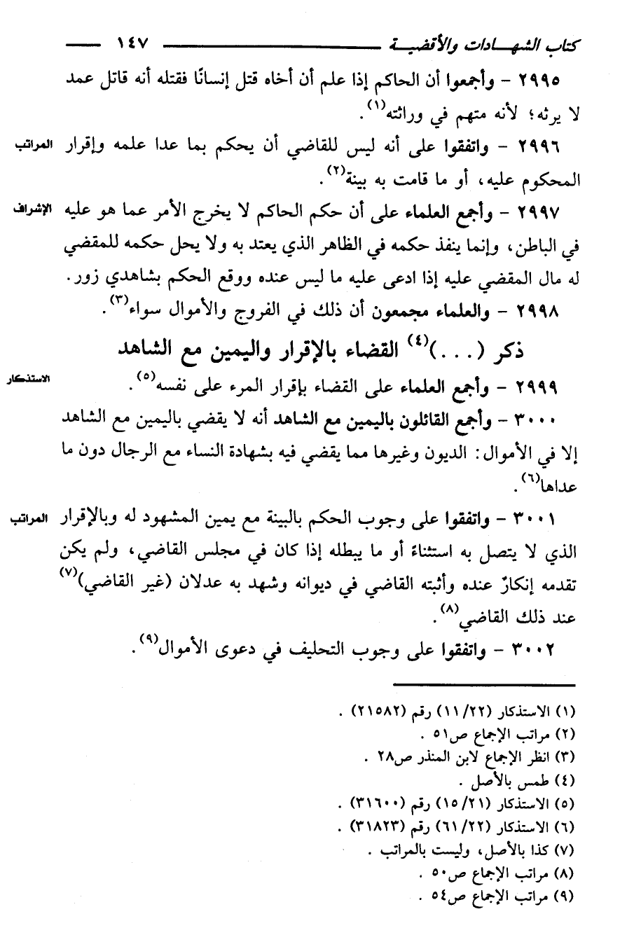 ٣٠٠٠ - وأجمع القائلون باليمين مع الشاهد أنه لا يقضي باليمين مع الشاهد إلا في الأموال: الديون وغيرها مما يقضي فيه بشهادة النساء مع الرجال دون ما عداها.