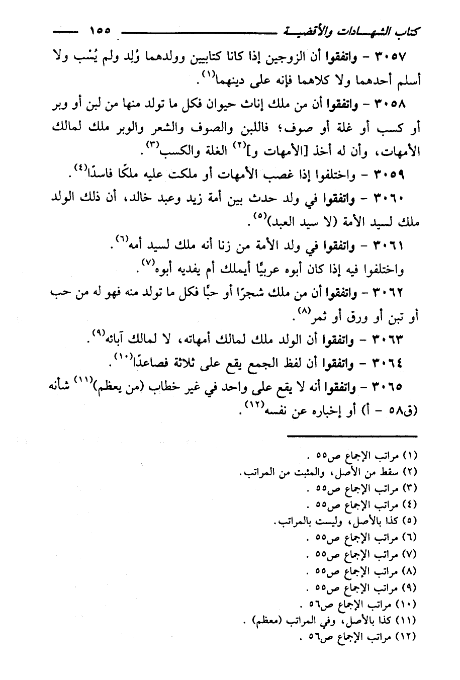 ٣٠٦٠ - واتفقوا في ولد حدث بين أمة زيد وعبد خالد، أن ذلك الولد ملك لسيد الأمة (لا سيد العبد).