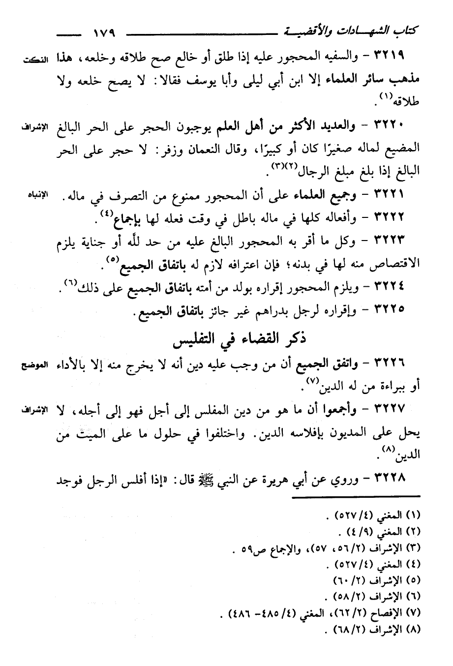 ٣٢٢٠ - والعديد الأكثر من أهل العلم يوجبون الحجر على الحر البالغ المضيع لماله صغيرًا كان أو كبيرًا، وقال النعمان وزفر: لا حجر على الحر البالغ إذا بلغ مبلغ الرجال.