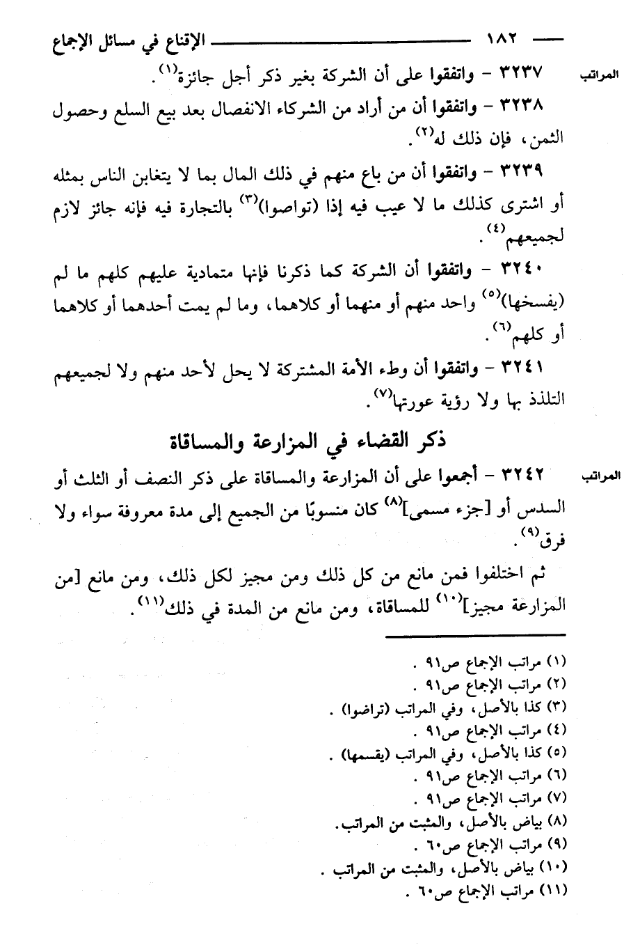 ٣٢٤٢ - أجمعوا على أن المزارعة والمساقاة على ذكر النصف أو الثلث أو السدس أو [جزء مسمى] كان منسوبًا من الجميع إلي مدة معروفة سواء ولا فرق.