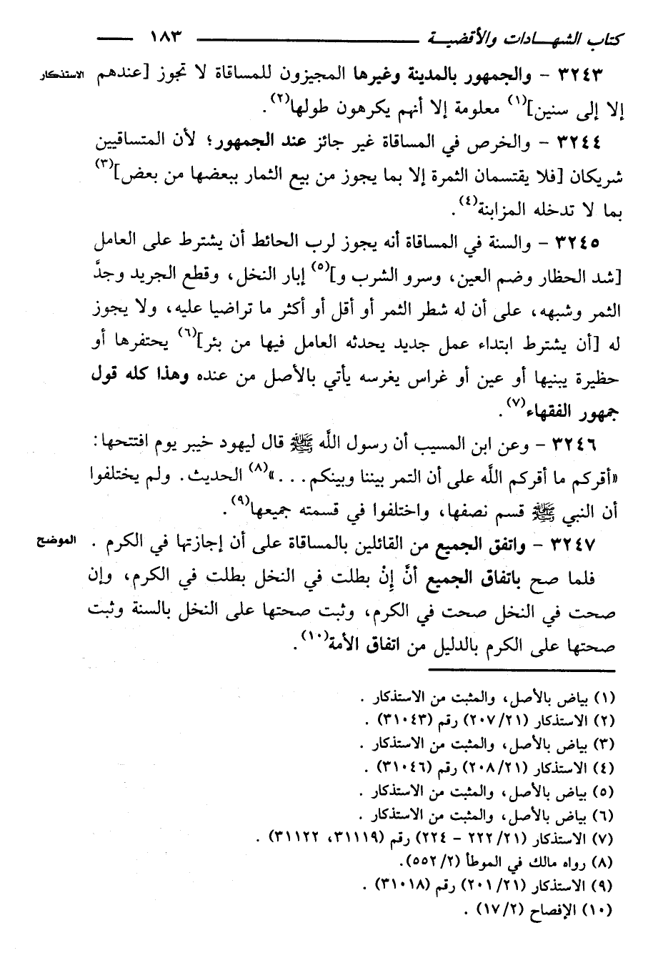 ٣٢٤٥ - والسنة في المساقاة أنه يجوز لرب الحائط أن يشترط على العامل [شد الحظار وضم العين، وسرو الشرب و] إبار النخل، وقطع الجريد وجد الثمر وشبهه، على أن له شطر الثمر أو أقل أو أكثر ما تراضيا عليه، ولا يجوز له [أن يشترط ابتداء عمل جديد يحدثه العامل فيه من بئر] يحتفرها أو حظيرة يبنيها أو عين أو غراس يغرسه يأتى بالأصل من عنده وهذا كله قول جمهور الفقهاء.