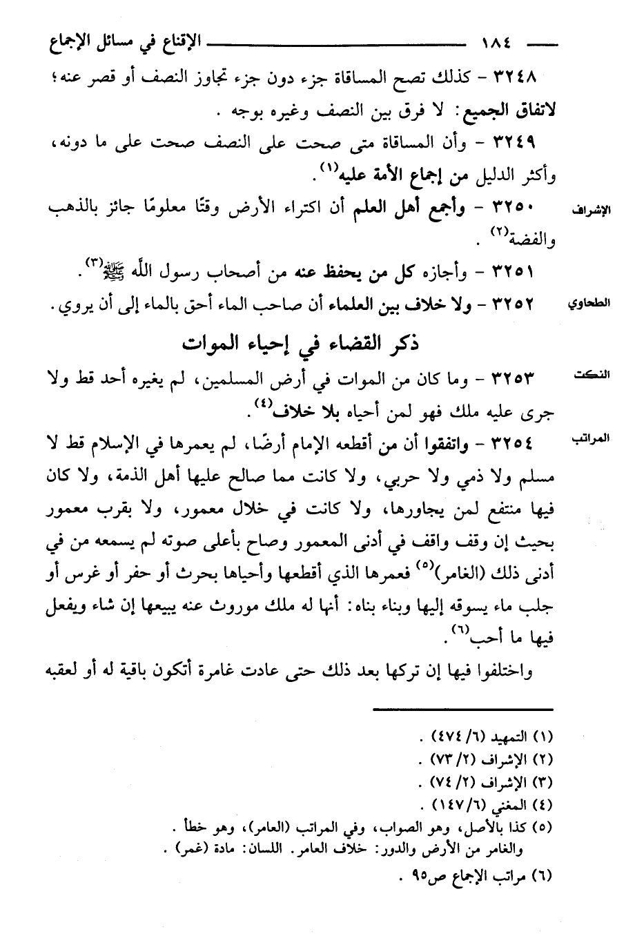 ٣٢٥٤ - واتفقوا أن من أقطعه الإمام أرضًا، لم يعمرها في الإسلام قط لا مسلم ولا ذمي ولا حربي، ولا كانت مما صالح عليها أهل الذمة، ولا كان فيها منتفع لمن يجاورها، ولا كانت في خلال معمور، ولا بقرب معمور بحيث إن وقف واقف في أدنى المعمور وصاح بأعلى صوته لم يسمعه من في أدني ذلك (الغامر) فعمرها الذي أقطعها وأحياها بحرث أو حفر أو غرس أو جلب ماء يسوقه إليها وبناء بناه: أنها له ملك موروث عنه يبيعها إن شاء ويفعل فيها ما أحب.