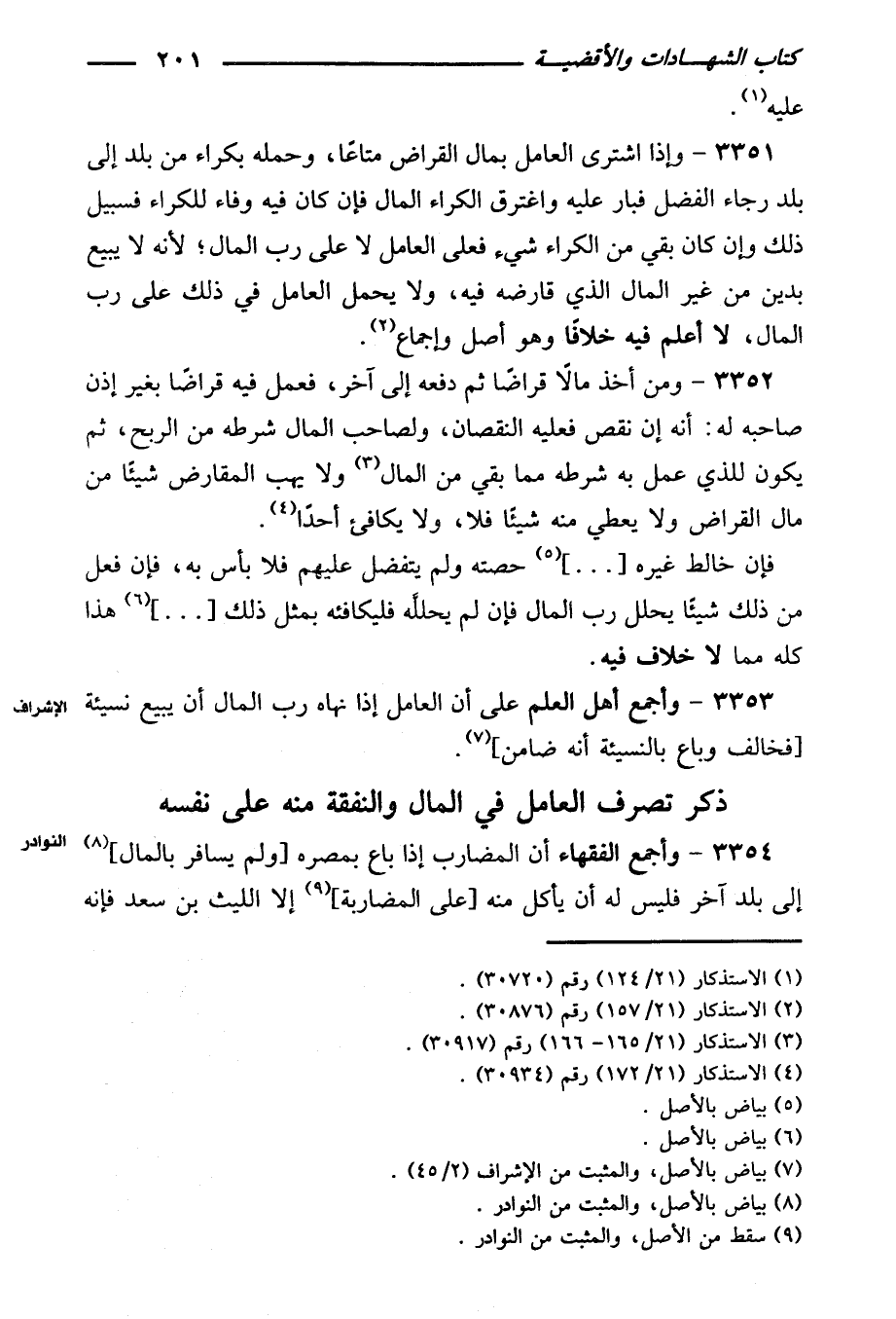 ٣٣٥٤ - وأجمع الفقهاء أن المضارب إذا باع بمصره [ولم يسافر بالمال] إلي بلد آخر فليس له أن يأكل منه [على المضاربة] إلا الليث بن سعد فإنه