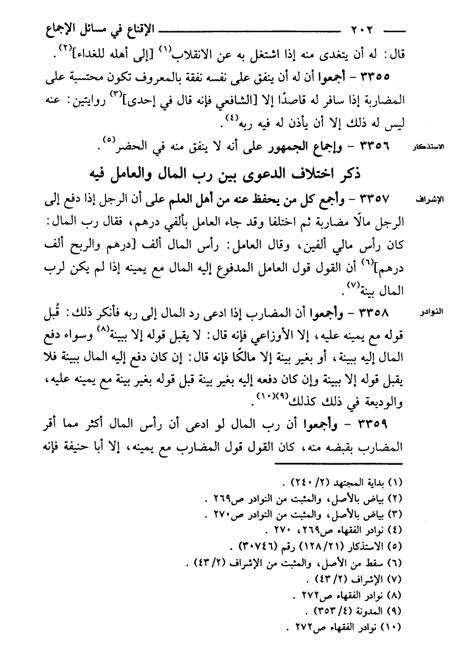 ٣٣٥٥ - أجمعوا أن له أن ينفق على نفسه نفقة بالمعروف تكون محتسبة على المضاربة إذا سافر له قاصدًا إلا [الشافعي فإنه قال في أحدى] روايتين: عنه ليس له ذلك إلا أن يأذن له فيه ربه.