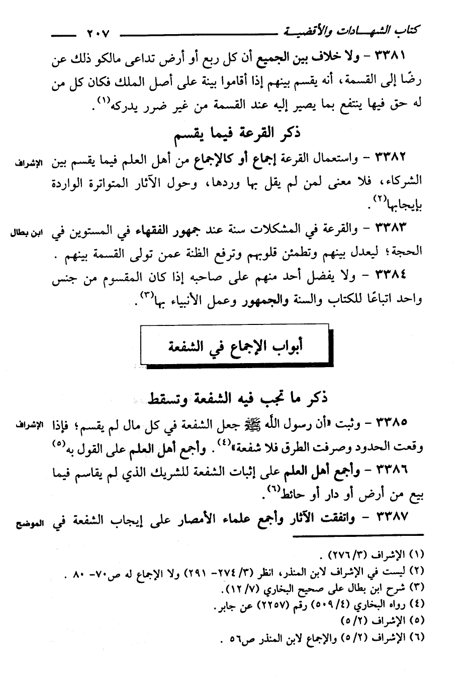 ٣٣٨٢ - واستعمال القرعة إجماع أو كالإجماع من أهل العلم فيما يقسم بين الشركاء، فلا معنى لمن لم يقل بها وردها، وحول الآثار المتواترة الواردة بإيجابها.