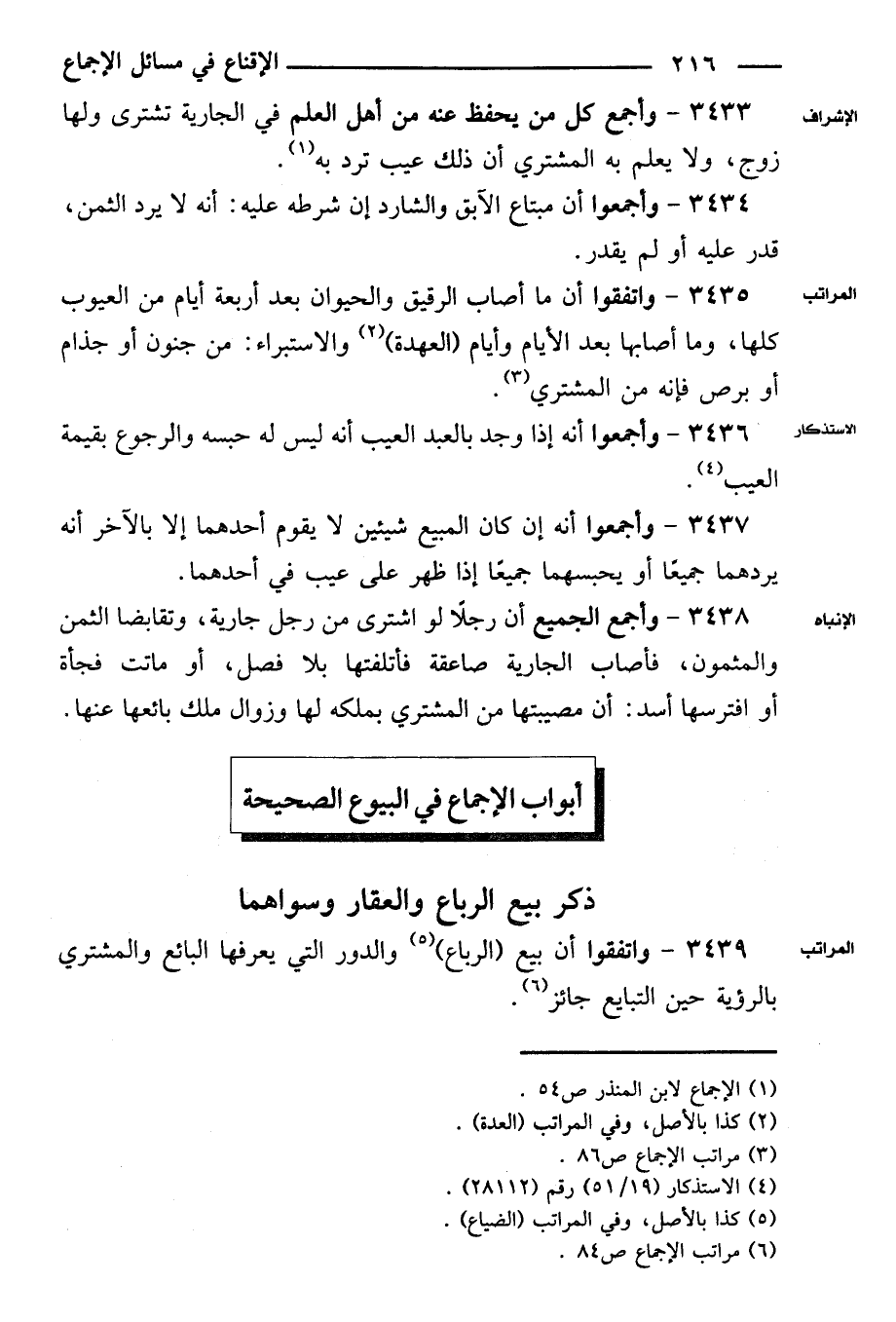 ٣٤٣٩ - واتفقوا أن بيع (الرباع) والدور التي يعرفها البائع والمشتري بالرؤية حين التبايع جائز.
