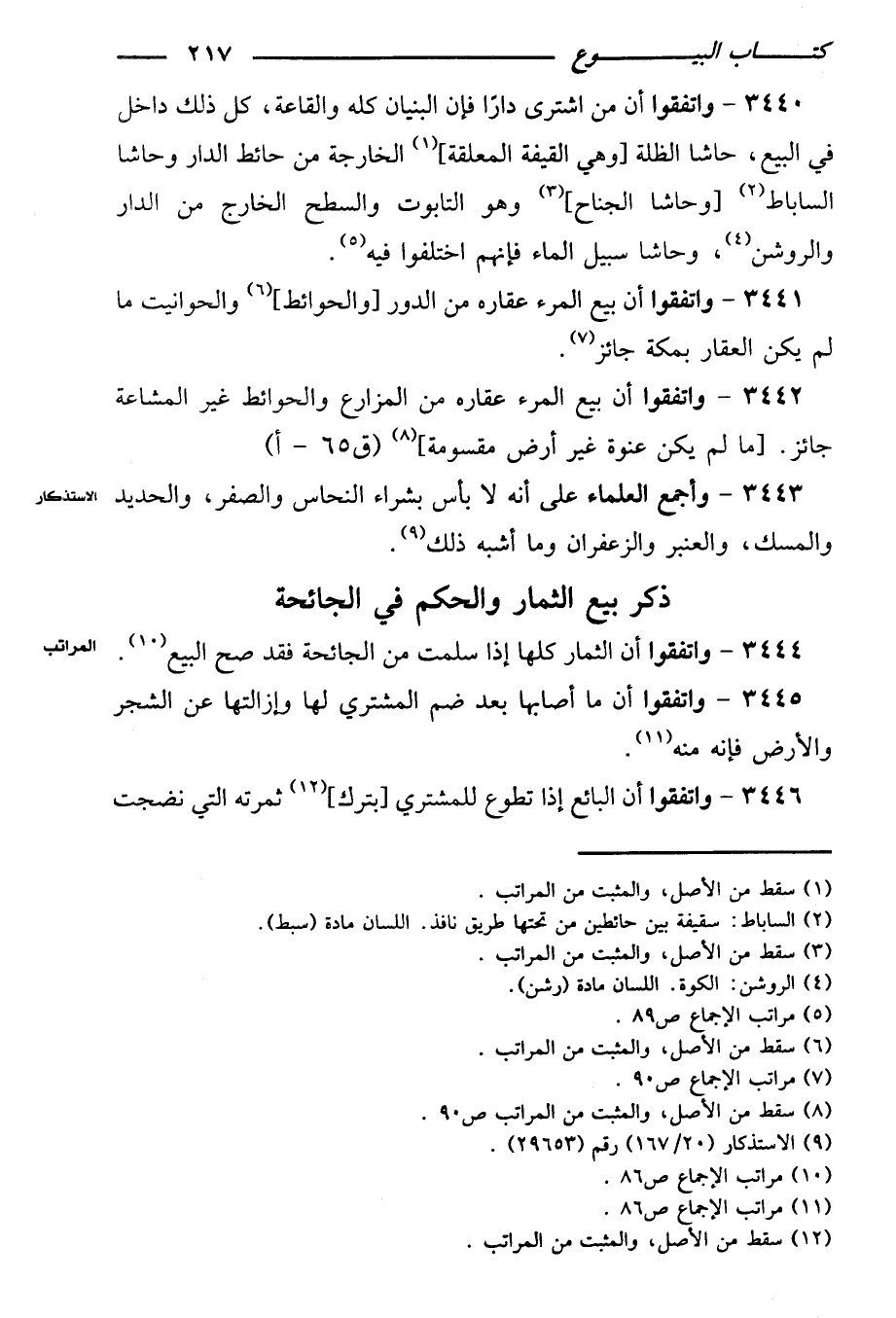 ٣٤٤٠ - واتفقوا أن من اشترى دارًا فإن البنيان كله والقاعة، كل ذلك داخل في البيع، حاشا الظلة [وهي القيفة المعلقة] الخارجة من حائط الدار وحاشا الساباط [وحاشا الجناح] وهو النابوت والسطح الخارج من الدار والروشن، وحاشا سبيل الماء فإنهم اختلفوا فيه.