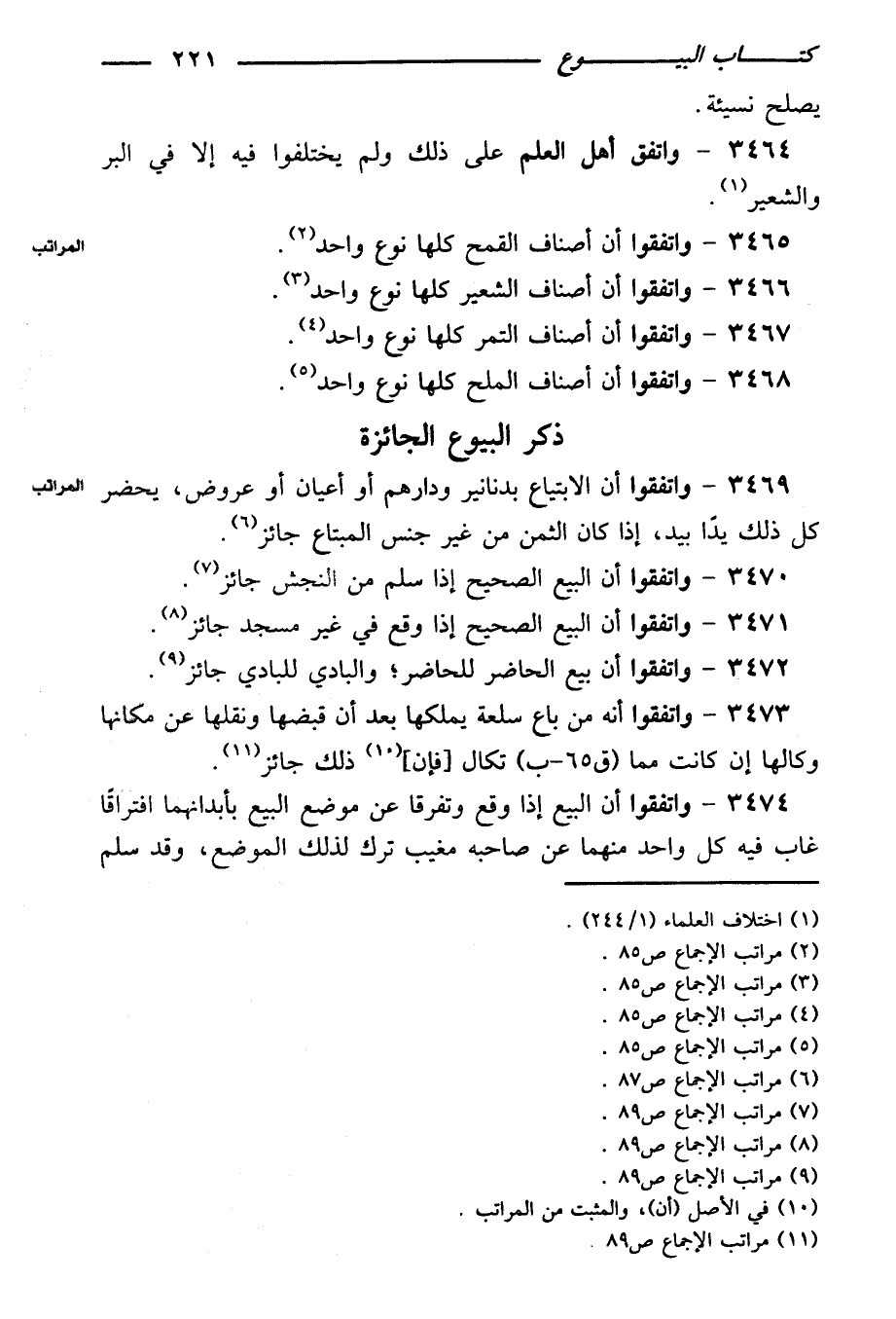 ٣٤٦٩ - واتفقوا أن الابتياع بدنانير ودارهم أو أعيان أو عروض، يحضر كل ذلك يدًا بيد، إذا كان الثمن من غير جنس المبتاع جائز.