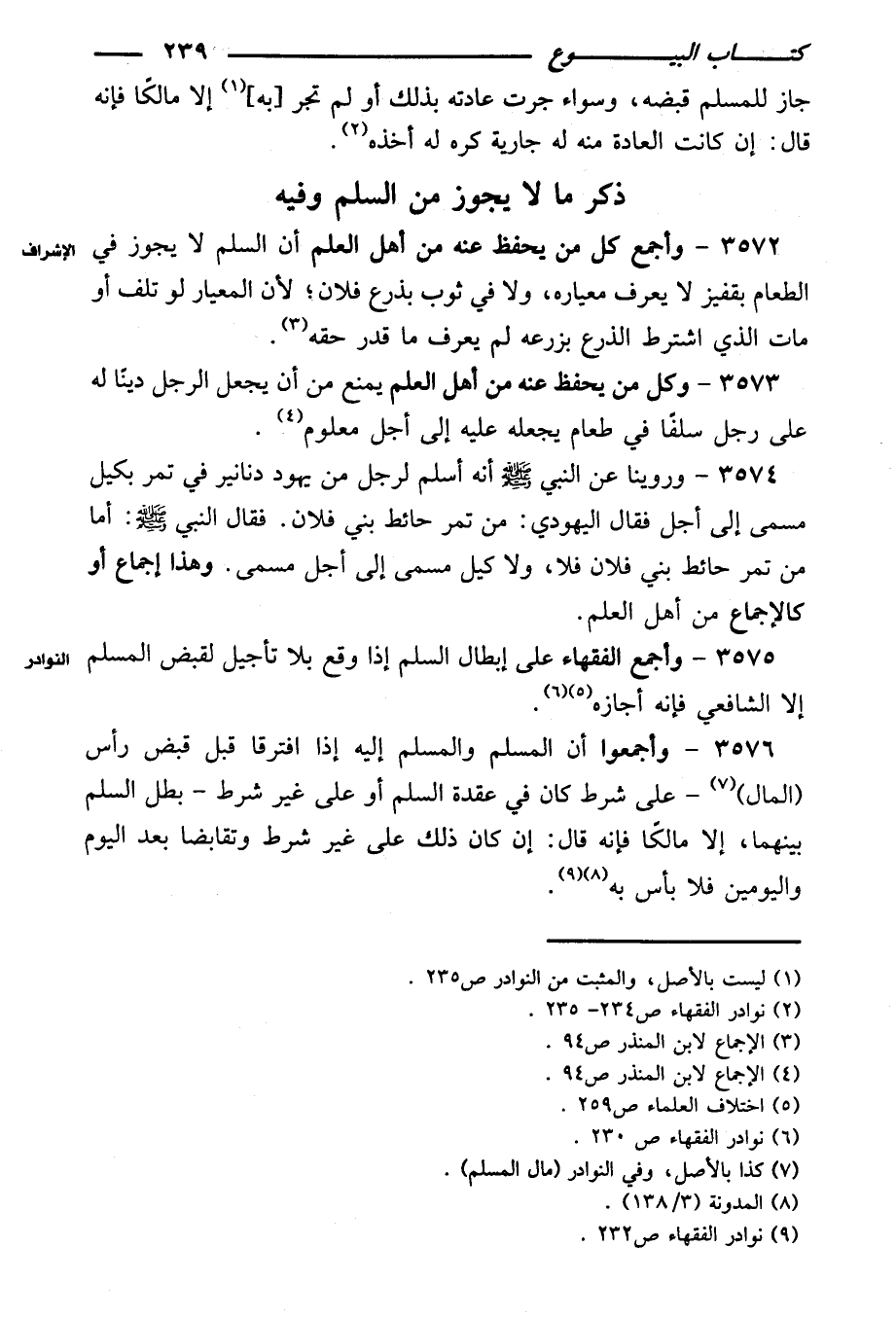 ٣٥٧٤ - وروينا عن النبي صلى الله عليه وسلم أنه أسلم لرجل من يهود دنانير في تمر بكيل مسمى إلي أجل فقال اليهودي: من تمر حائط بني فلان. فقال النبي صلى الله عليه وسلم: أما من تمر حائط بني فلان فلا، ولا كيل مسمي إلى أجل مسمى. وهذا إجماع أو كالإجماع من أهل العلم.