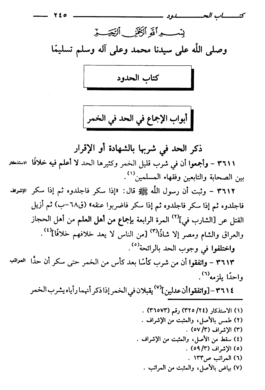 ٣٦١٢ - وثبت أن رسول الله صلى الله عليه وسلم قال: «إذا سكر فاجلدوه ثم إذا سكر فاجلدوه ثم إذا سكر فاجلدوه ثم إذا سكر فاضربوا عنقه» ثم أزيل القتل عن [الشارب في] المرة الرابعة بإجماع من اه لالعلم من أهل الحجاز والعراق والشام ومصر إذ شاذًا [من الناس لا يعد خلافهم خلافًا].