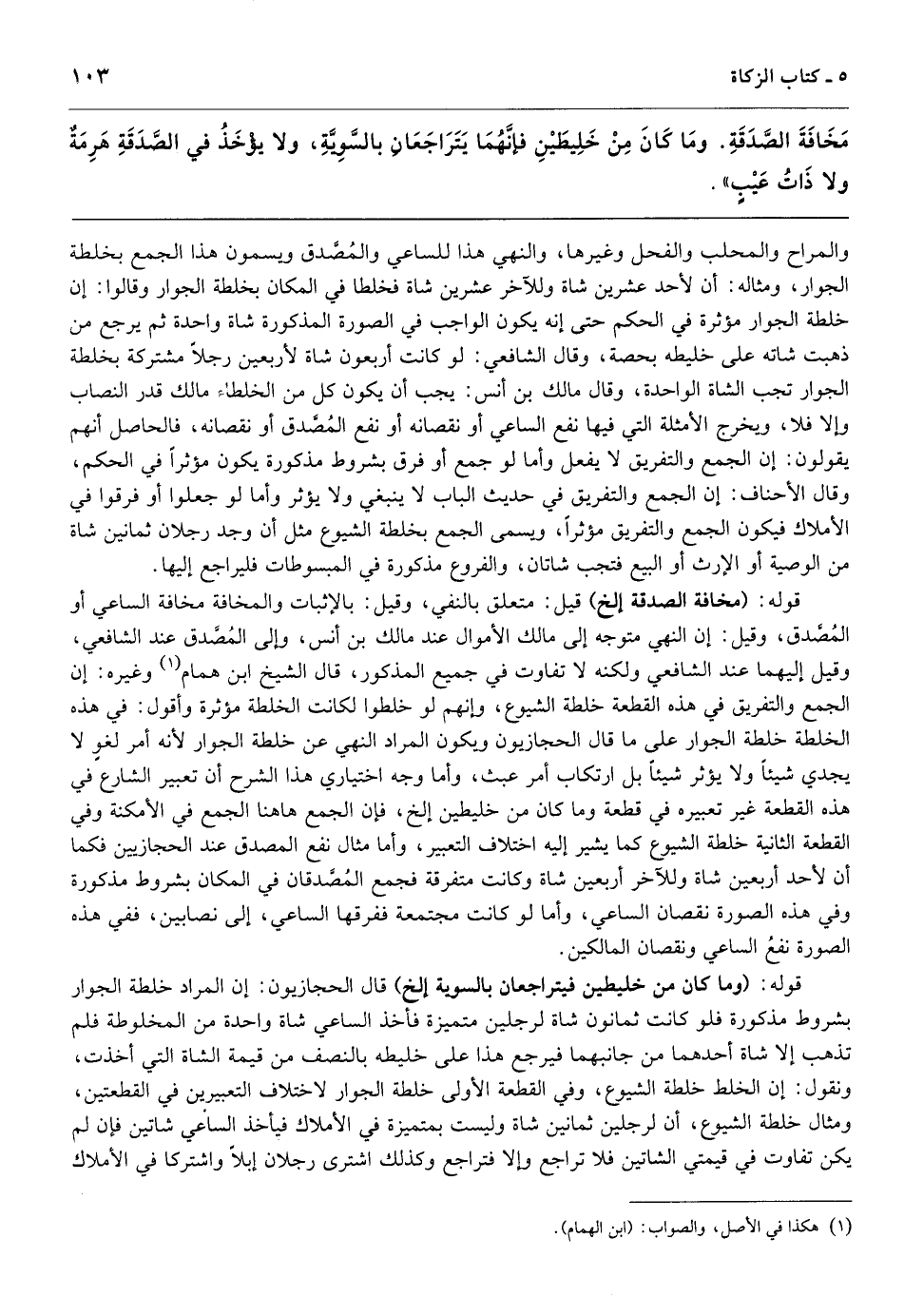 والمراح والمحلب والفحل وغيرها، والنهي هذا للساعي والمُصَّدق ويسمون هذا الجمع بخلطة الجوار، ومثاله: أن لأحد عشرين شاة وللآخر عشرين شاة فخلطا في المكان بخلطة الجوار وقالوا: إن خلطة الجوار مؤثرة في الحكم حتى إنه يكون الواجب في الصورة المذكورة شاة واحدة ثم يرجع من ذهبت شاته على خليطه بحصة، وقال الشافعي: لو كانت أربعون شاة لأربعين رجلاً مشتركة بخلطة الجوار تجب الشاة الواحدة، وقال مالك بن أنس: يجب أن يكون كل من الخلطاء مالك قدر النصاب وإلا فلا، ويخرج الأمثلة التي فيها نفع الساعي أو نقصانه أو نفع المُصَّدق أو نقصانه، فالحاصل أنهم يقولون: إن الجمع والتفريق لا يفعل وأما لو جمع أو فرق بشروط مذكورة يكون مؤثراً في الحكم، وقال الأحناف: إن الجمع والتفريق في حديث الباب لا ينبغي ولا يؤثر وأما لو جعلوا أو فرقوا في الأملاك فيكون الجمع والتفريق مؤثراً، ويسمى الجمع بخلطة الشيوع مثل أن وجد رجلان ثمانين شاة من الوصية أو الإرث أو البيع فتجب شاتان، والفروع مذكورة في المبسوطات فليراجع إليها.