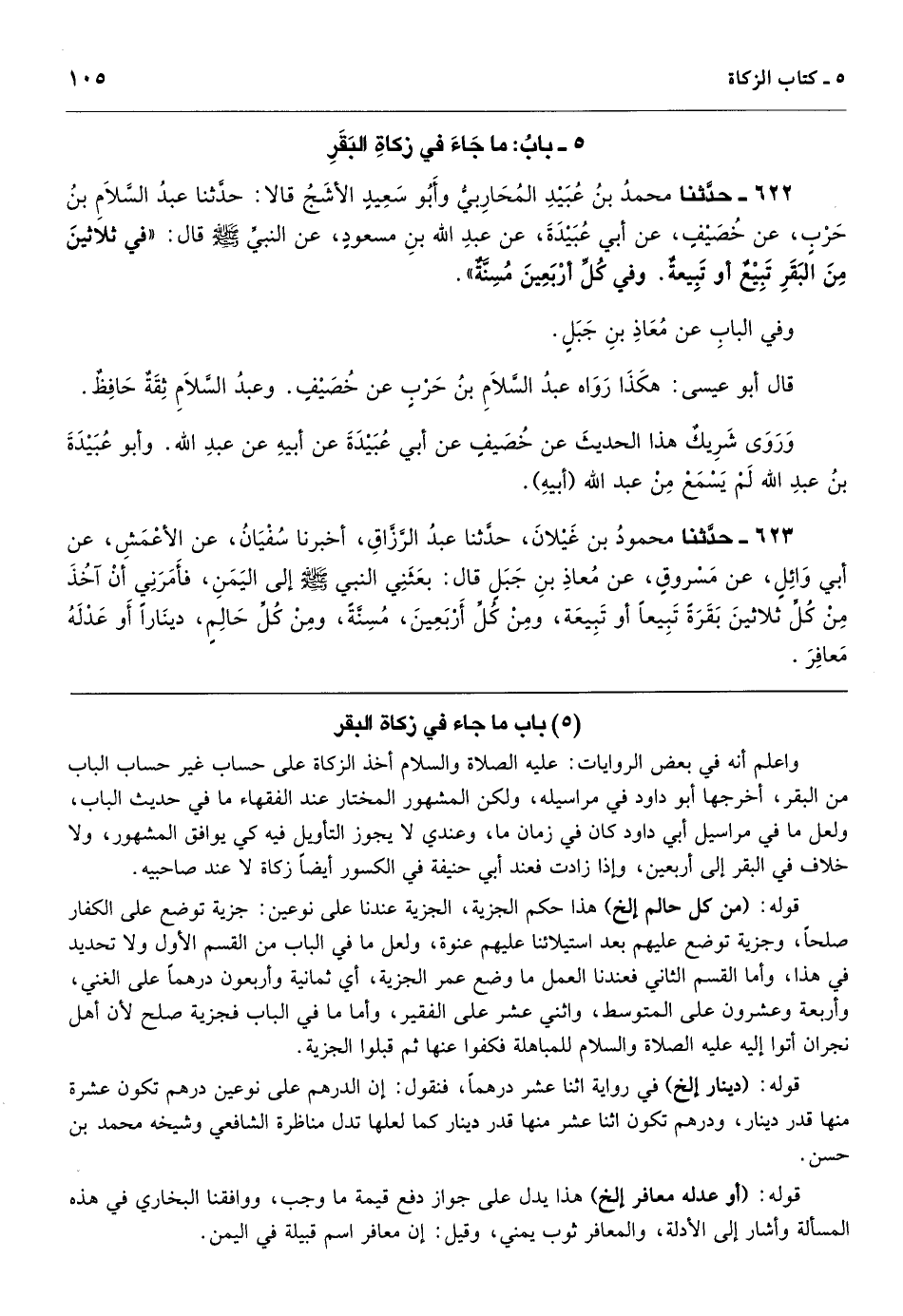 [622] واعلم أنه في بعض الروايات: عليه الصلاة والسلام أخذ الزكاة على حساب غير حساب الباب من البقر، أخرجها أبو داود في مراسيله، ولكن المشهور المختار عند الفقهاء ما في حديث الباب، ولعل ما في مراسيل أبي داود كان في زمان ما، وعندي لا يجوز التأويل فيه كي يوافق المشهور، ولا خلاف في البقر إلى أربعين، وإذا زادت فعند أبي حنيفة في الكسور أيضاً زكاة لا عند صاحبيه.