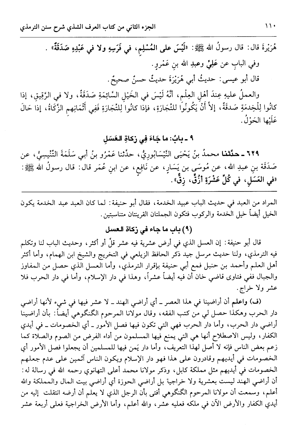[629] قال أبو حنيفة: إن العسل الذي في أرض عشرية فيه عشر قلَّ أو أكثر، وحديث الباب لنا وتكلم فيه الترمذي، ولنا حديث مرسل جيد ذكر الحافظ الزيلعي في التخريج والشيخ ابن الهمام، وأما أكثر أهل العلم وأحمد بن حنبل فمع أبي حنيفة بإقرار الترمذي، وأما العسل الذي حصل من المفاوز والجبال ففي فتاوى قاضي خان أن فيه أيضاً عشراً، وهذا في دار الإسلام، وأما في دار الحرب فلا عشر ولا خراج.