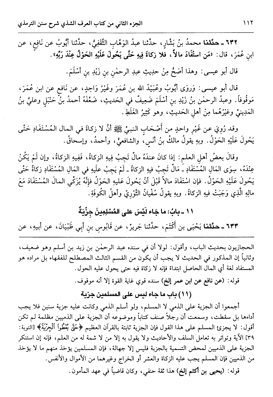 الحجازيون بحديث الباب، وأقول: لولا أن في سنده عبد الرحمن بن زيد بن أسلم وهو ضعيف، وثانياً إن المذكور في الحديث لا يجب أن يكون من القسم الثالث المصطلح للفقهاء بل مراده هو المستفاد لغة أي المال الحاصل ابتداءً فإنه لا زكاة فيه حتى يحول عليه الحول.