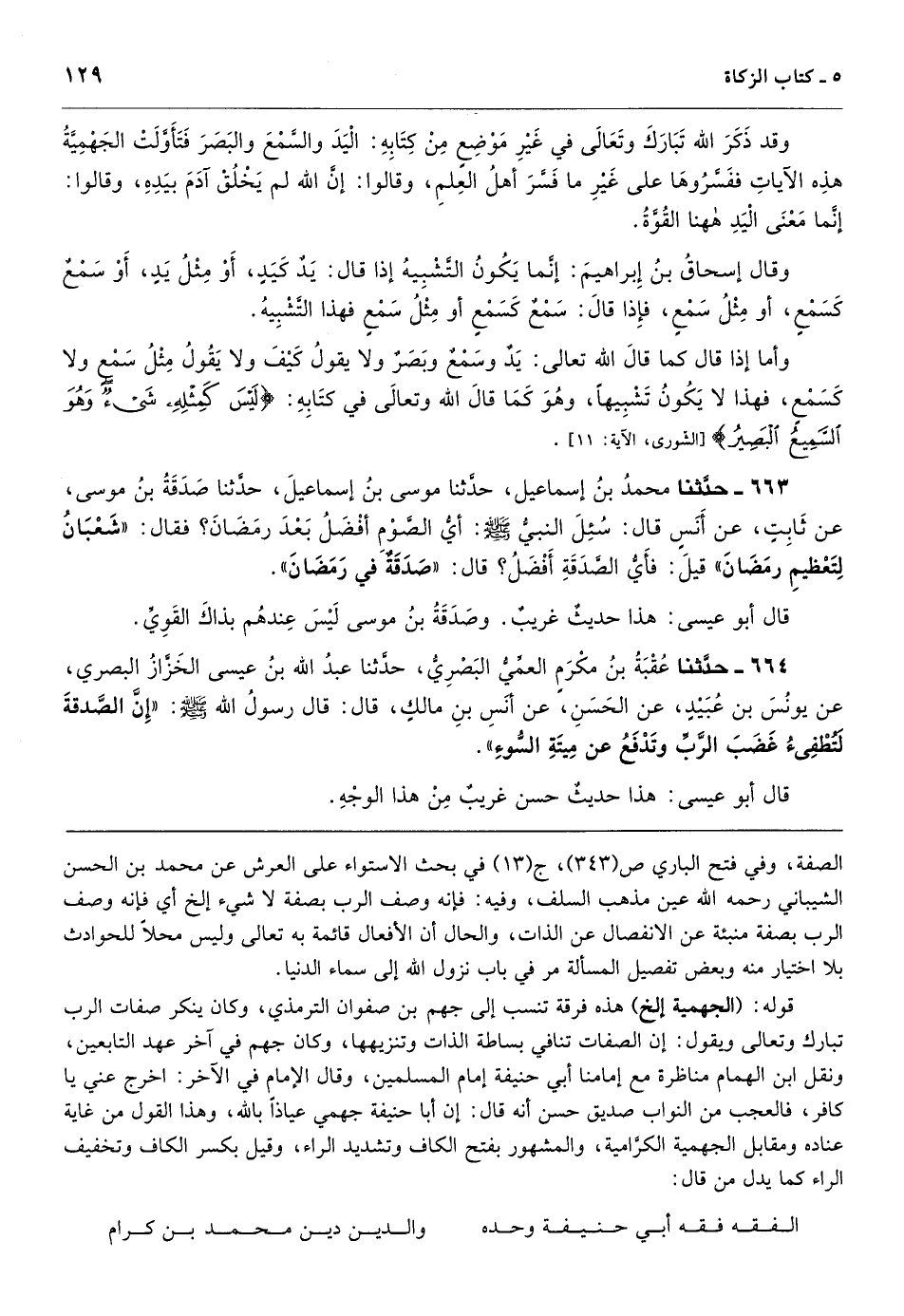 الصفة، وفي فتح الباري ص (343) ، ج (13) في بحث الاستواء على العرش عن محمد بن الحسن الشيباني رحمه الله عين مذهب السلف، وفيه: فإنه وصف الرب بصفة لا شيء إلخ أي فإنه وصف الرب بصفة منبئة عن الانفصال عن الذات، والحال أن الأفعال قائمة به تعالى وليس محلاً للحوادث بلا اختيار منه وبعض تفصيل المسألة مر في باب نزول الله إلى سماء الدنيا.
