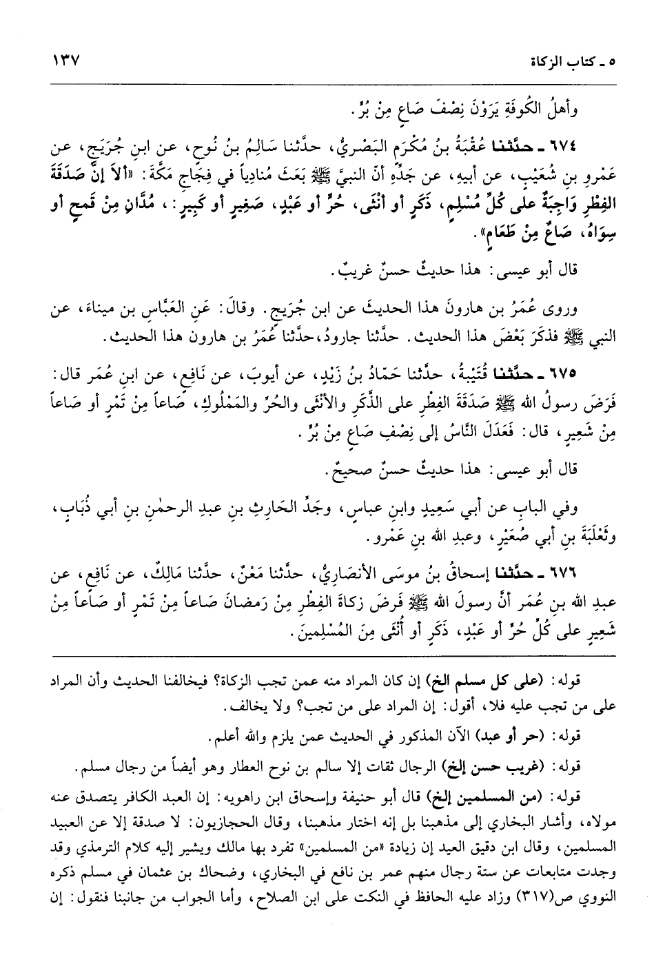 قوله: (من المسلمين إلخ) قال أبو حنيفة وإسحاق ابن راهويه: إن العبد الكافر يتصدق عنه مولاه، وأشار البخاري إلى مذهبنا بل إنه اختار مذهبنا، وقال الحجازيون: لا صدقة إلا عن العبيد المسلمين، وقال ابن دقيق العيد إن زيادة «من المسلمين» تفرد بها مالك ويشير إليه كلام الترمذي وقد وجدت متابعات عن ستة رجال منهم عمر بن نافع في البخاري، وضحاك بن عثمان في مسلم ذكره النووي ص (317) وزاد عليه الحافظ في النكت على ابن الصلاح، وأما الجواب من جانبنا فنقول: إن