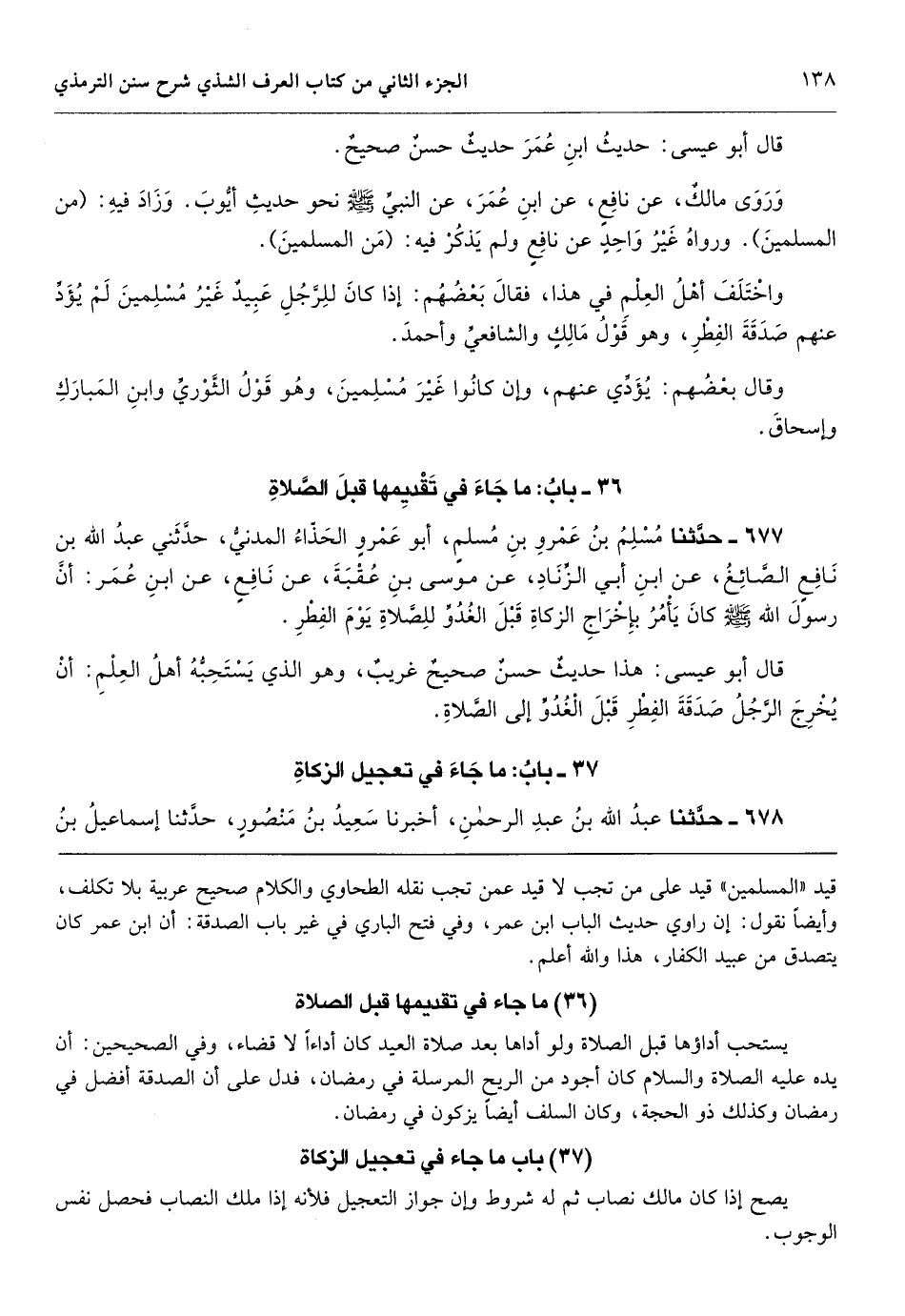 قيد «المسلمين» قيد على من تجب لا قيد عمن تجب نقله الطحاوي والكلام صحيح عربية بلا تكلف، وأيضاً نقول: إن راوي حديث الباب ابن عمر، وفي فتح الباري في غير باب الصدقة: أن ابن عمر كان يتصدق من عبيد الكفار، هذا والله أعلم.